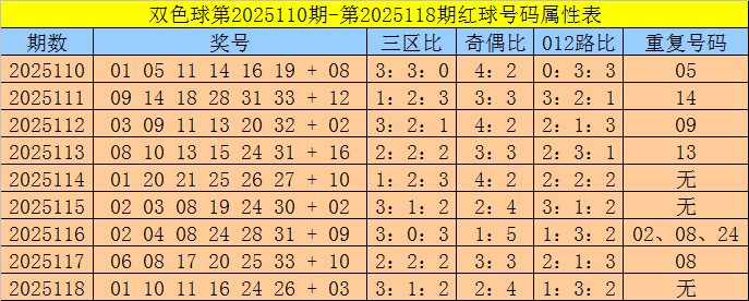 福彩双色球第2025118期奖号为:01 10 11 16 24 26 + 03,红球奇偶比为2:4,三区比为3:1:2,012路比为1:3:2,重号:无。