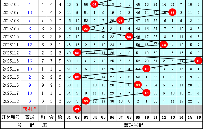 蓝球号码:最近9期分别开出蓝球号码08、12、02、16、10、02、09、10、03,蓝球号码012路个数比为3:3:3,其中0路蓝球开出最少,本期可以放弃,参考蓝球02、05、11、14。