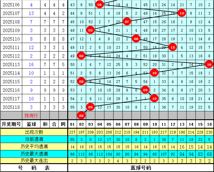 1路红球上期开出3个:01、10、16,表现较热,最近50期1路红球出现87个,前10期1路红球开出20个,走势与理论相当,本期注意1路红球逐渐温冷,预计开出1个,注意红球:25。