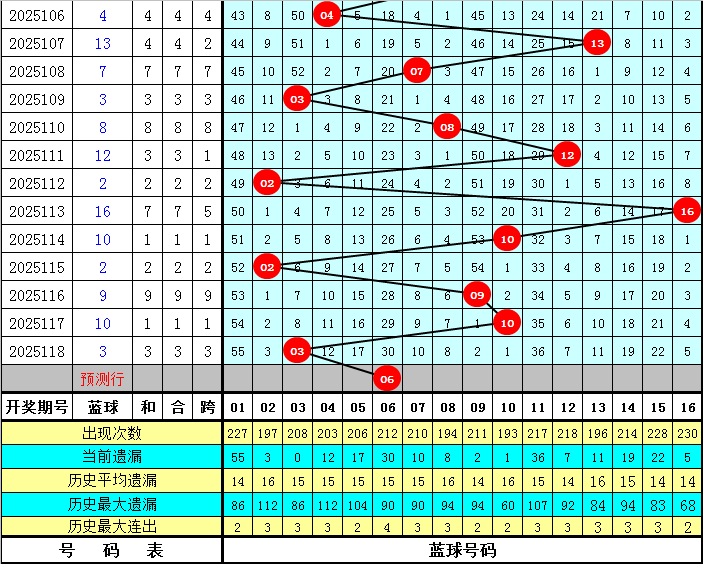 蓝球分析:上期蓝球开出小 号03,最近10期蓝球号码大小比为5:5,大小蓝球开出频次相等,本期看好小 号蓝球,参考蓝球06。