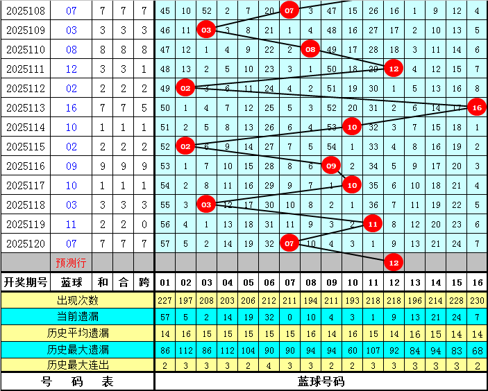 蓝球分析:上期蓝球开出号码07,下降4个点位,最近10期蓝球号码升平降分别为:升、降、升、降、降、升、升、降、升、降,本期防蓝球号码上升,一码蓝球关注12。