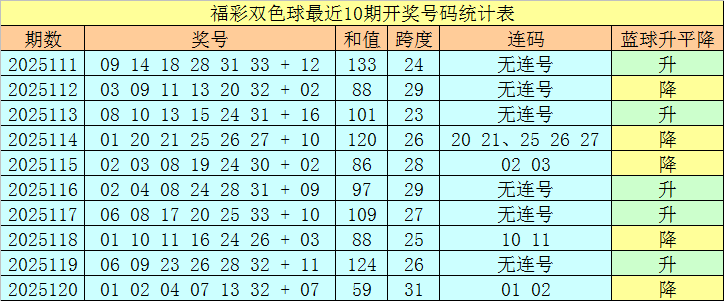 上期开奖:福彩双色球第2025120奖号开出:01 02 04 07 13 32 + 07,红球号码和值为59,首尾间距为31,包含连号:01 02。