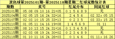 双色球最近7周星期二红球尾数统计表: