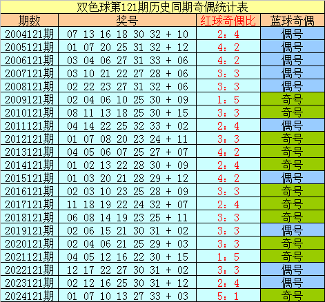 蓝球分析:在第121期历史同期开奖中,蓝球号码奇偶比为11:10,最近5年同期奇偶走势为:奇、奇、偶、偶、奇,今年同期预计再出奇数号码,参考蓝球11。