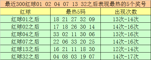 红球冷码统计:双色球第2025120期开出红球奖号分别为:01、02、04、07、13、32,在最近300期开奖中,各号码出现之后其下期出现最少的5个红球分别为: