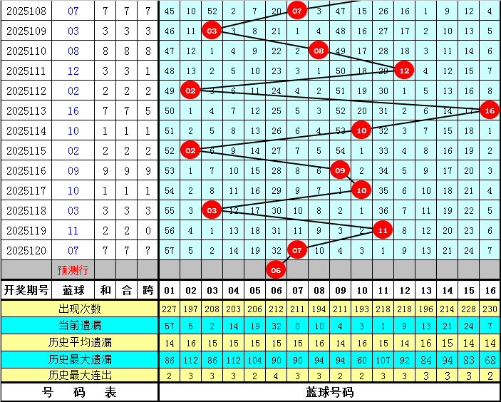 上期开出蓝球号码07,该号码在最近300期中出现了16次,其下期分别开出:蓝球03出现4次,蓝球05、15、16出现2次,蓝球01、02、06、10、13出现1次,蓝球04、07、08、09、11、12、14出现0次。本期五码蓝球参考05、06、10、15、16,独蓝关注06。