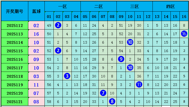 上期蓝球开出号码08,近十期蓝球在一区开3枚,二区开出号码2枚,三区开出4枚,四区开出1枚,区间比3:2:4:1,本期推荐蓝球出现在四区,重点关注16。