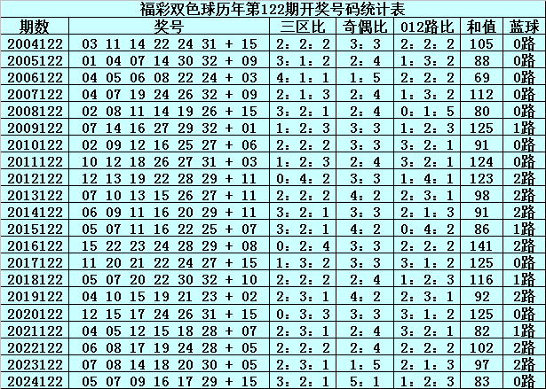 在第122期历史同期奖号中,红球三区分布总比例为40:46:40,奇偶总比例为57:69,012路比为37:45:44,和值分布在69-141之间,蓝球号码012路总比例为10:4:7。