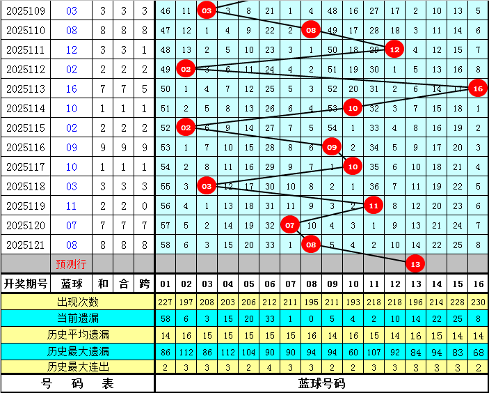 蓝球分析:上期蓝球开出号码08,上升1个点位,最近10期蓝球号码升平降分别为:降、升、降、降、升、升、降、升、降、升,本期防蓝球号码上升,一码蓝球关注13。