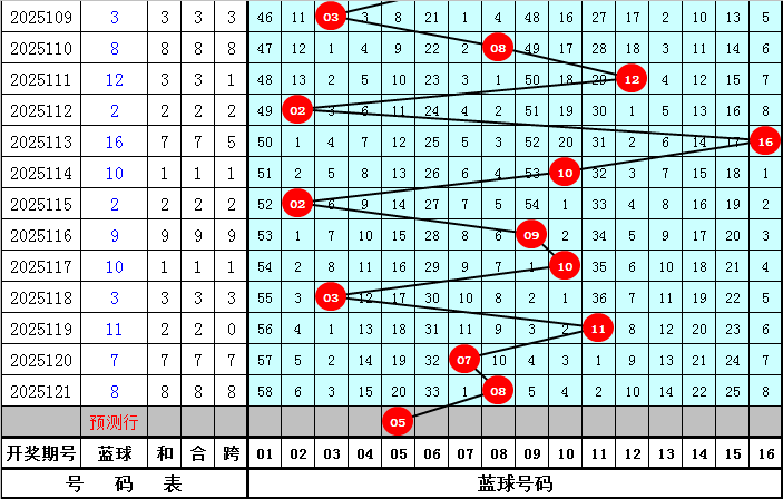 前9期开出8个蓝球号码,蓝球以冷码为主,热码蓝球开出相对较少,还没有出现的蓝球为:01、04、05、06、12、13、14、15,共8个,本期防蓝球为冷码,遗漏值较大,参考蓝球号码05。