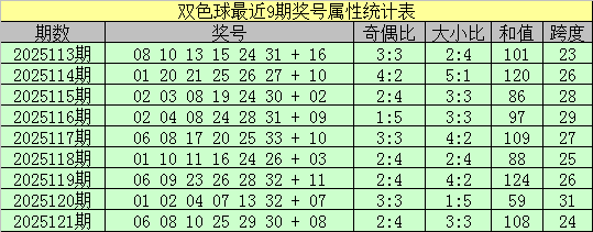 双色球上期第2025121期奖号为06 08 10 25 29 30 + 08,红球号码奇偶比为2:4,大小比为3:3,和值为108,跨度:24。