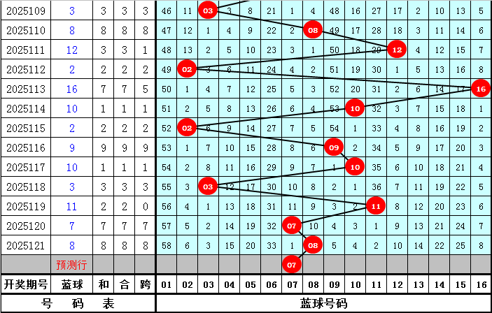 蓝球综合分析:上期蓝球开出遗漏10期号码08,近10期奇偶比为4:6,偶数蓝球走势积极,本期注意蓝球开出奇数;目前遗漏值12以上的冷码蓝球有7个:01、04、05、06、13、14、15,蓝球冷温热比为7:3:6,本期预计温热蓝球号码再出,一码蓝球推荐07。
