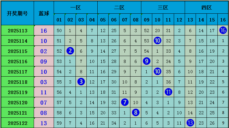上期蓝球开出号码13,近十期蓝球在一区开2枚,二区开出号码2枚,三区开出4枚,四区开出2枚,区间比2:2:4:2,本期推荐蓝球出现在三区,重点关注11。