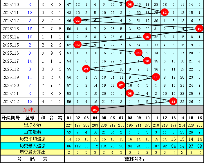 蓝球分析【一区01-04,二区05-08,三区09-12,四区13-16】:上期蓝球为13,出现在第四区,近50期区间比为7:15:10:18,近10期区间比为2:2:4:2,本期关注第一区蓝球号码,参考蓝球04。