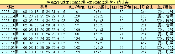 福彩双色球第2025122期红球奖号为:16、18、19、20、25、31,蓝球奖号为:13,其中红球和值为129,012路比为1:4:1,首尾和为47,质合比为2:4,蓝球属性为1路、质号。