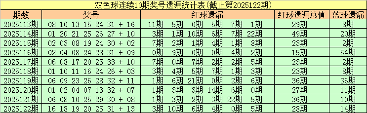 福彩双色球第2025122期奖号为:16、18、19、20、25、31 + 13,红球遗漏期数分别为:3、10、6、4、0、5,遗漏总值为28期 ,蓝球遗漏14期。