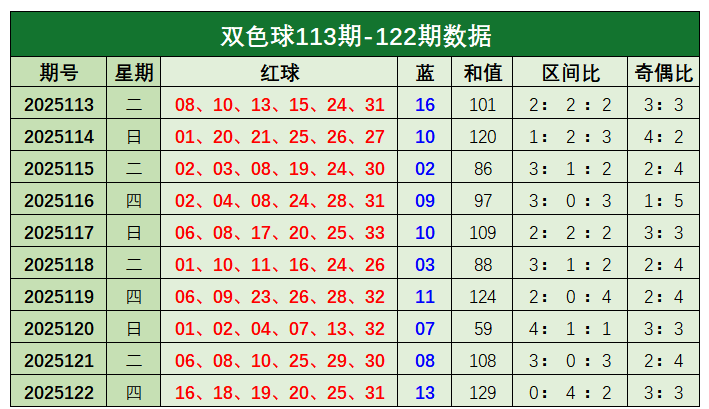 双色球第2025122开奖奖号:红球16、18、19、20、25、31,蓝球13。红球和值为129,区间比为0:4:2,奇偶比为3:3。蓝球开出13。