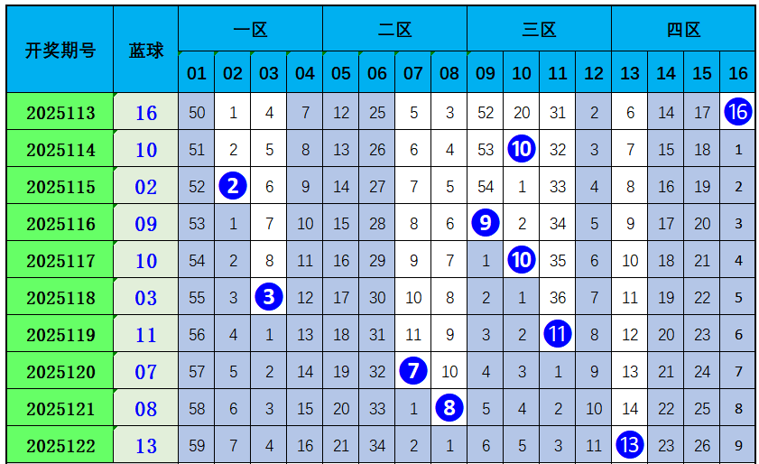 红一区(01-11):上期未开出红球,最近10期该区开出23个红球,出号较温,本期推荐奖号01、03、05。