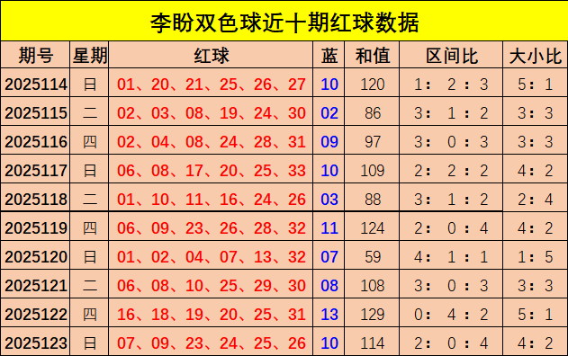 区间比分析:红一区(1-11)红二区(12-22)红三区(23-33),上期开出红球区间比2:0:4,近10期区间比23:11:26,3区号码出号较热,综合分析,本期预测各区出号均衡,区间比为2:2:2。