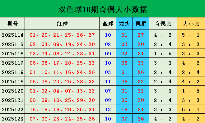 上期蓝球号码10,为大偶数,近50期蓝球奇偶比22:28,奇数偶数出号率偶数占优;近10期蓝球奇偶比5:5,奇数偶数出号率均衡。