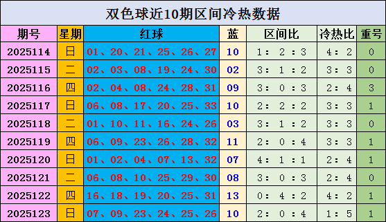 双色球第2025123期开出奖号:07 09 23 24 25 26+10。红球号码三区比为2:0:4,冷热比为1:5。