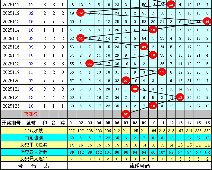 蓝球分析:小 号蓝球近期走势疲软,本期注意小 号蓝球回补,参考蓝球01、04、05、07。