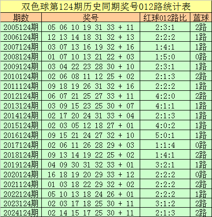 福彩双色球第2025124期历史同期王守礼012路奖号遗漏分析: