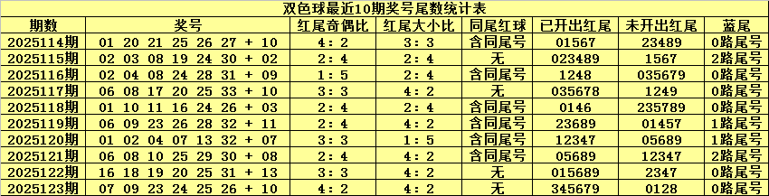双色球第2025123期奖号为:07 09 23 24 25 26 + 10,红球尾数为:345679,没有出现同尾红球。