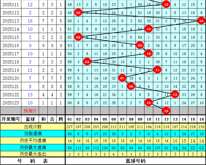 蓝球分析:蓝球上期开出大号10,最近10期蓝球号码大小比为6:4,大号蓝球表现活跃,本期继续关注大号蓝球,独蓝推荐12。