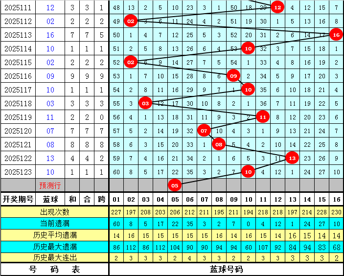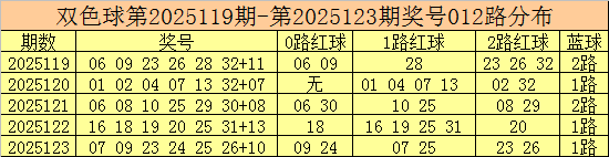 开奖回顾:双色球第2025123期开出奖号:07 09 23 24 25 26 + 10。其中,红球号码012路比为2:2:2,其中012路号码开出个数相等。蓝球号码为1路号码。