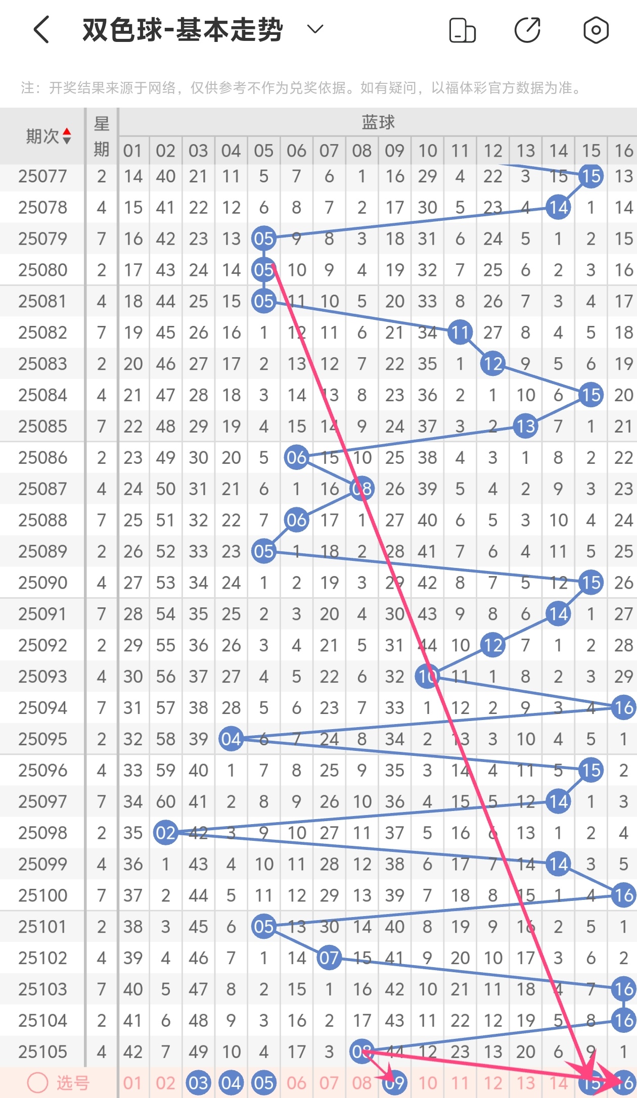 上期蓝球开出08,本期我们可以从上面走势图中看到选号的思路,04为斜连走势,10隔期回补走势,13为斜连走势,综合以上分析本期蓝球推荐03 04 05 09 15 16