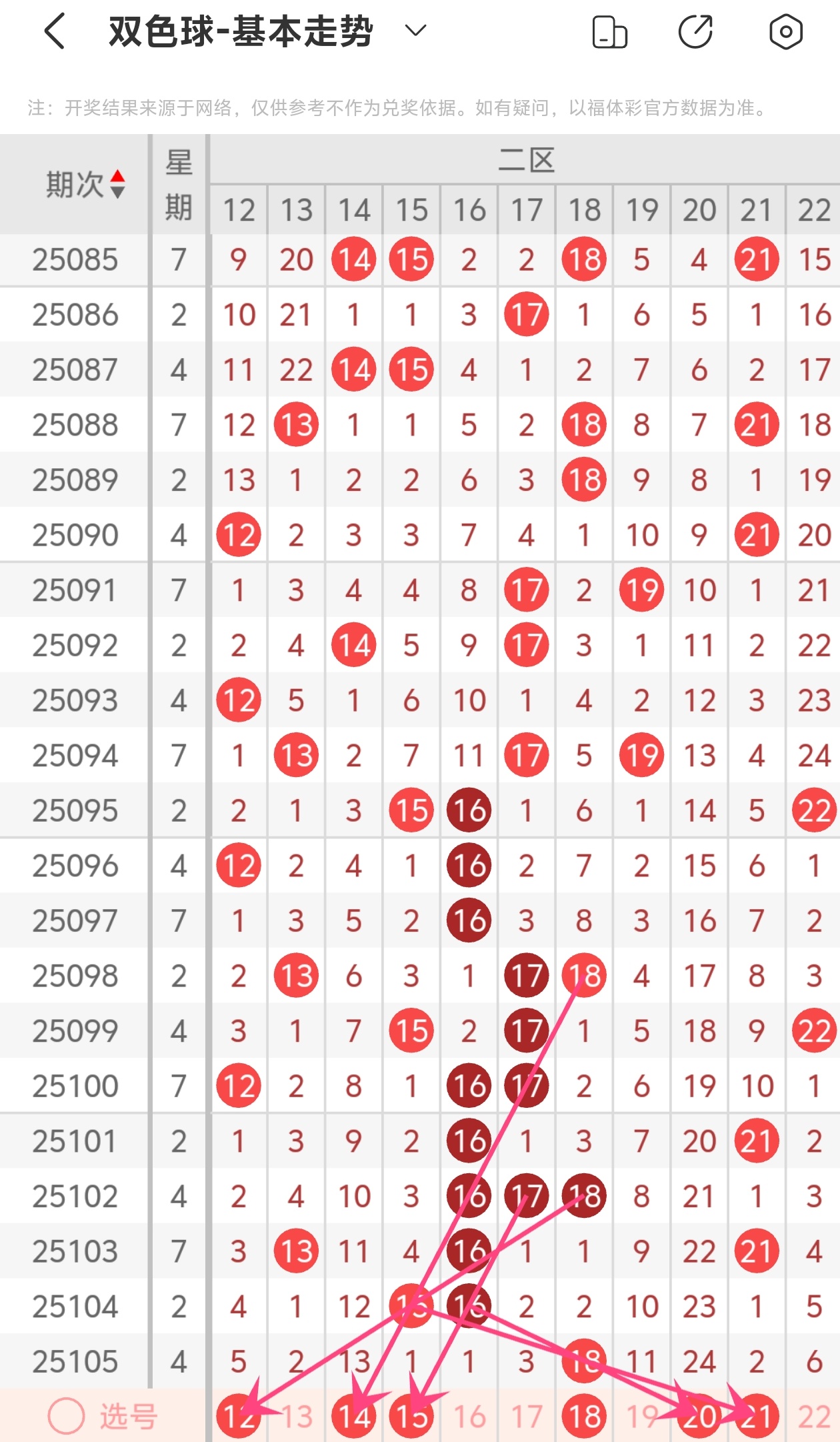 上期第二区间开出16,本期我们可以从上面走势图中看到选号的思路,12为斜连走势,14为斜连走势,15为斜连走势,20为斜连走势,21为斜连走势,综合以上分析本期第二区间推荐12 14 15 18 20 21