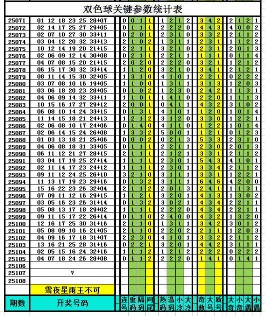 以下是作者手工统计的双色球关键参数统计表,对喜欢参数分析、过滤缩水、选号胆杀的技术性双色球爱好者有所帮助,其它读者可略过不看。