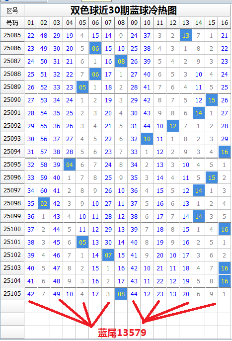 蓝球本期有热蓝7枚,冷蓝9枚,蓝球冷码数量稍多。上期开出冷蓝,由于近期蓝球冷热交替开出规律不明显,本期蓝球冷热难定。