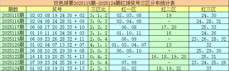 红三区(23-33):上期该区走温,开出1个红球,该区最近10期红球个数分布为:2、3、2、2、4、1、3、2、4、1,共开出24个红球,出号比例相对较高,本期看好该区再次热出,关注4个红球,红球大范围关注:23、25、26、27、28、30、31、32,红三区精选红球:26、27、28、30。