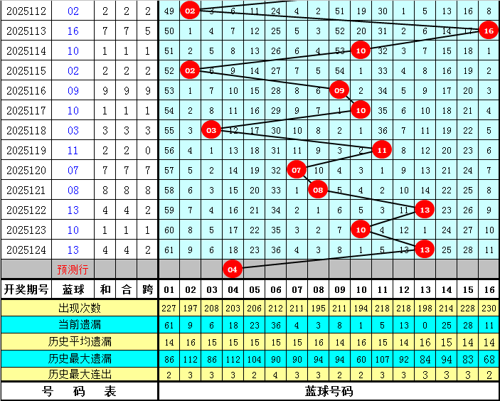 龙头分析:上周四第25122期龙头开出16,最近十周星期四龙头奇偶比为5:5,012路比为4:5:1,本期看好龙头下降,参考号码03。