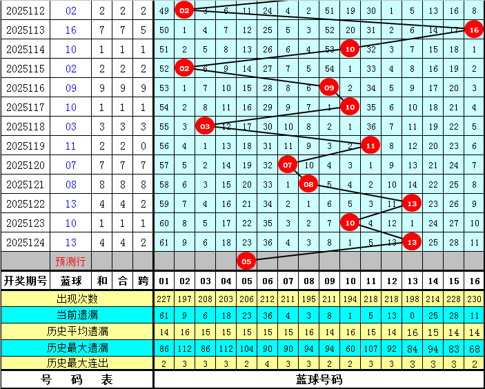 蓝球分析:最近9周星期四蓝球分别开出号码:15、14、07、08、07、12、09、11、13,本周星期四看好蓝球开出奇数号码,参考蓝球号码05。