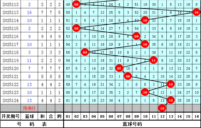蓝球分析:上期蓝球奖号开出13,为大号,上周四蓝球奖号开出13,最近十周四蓝球号码大小比为7:3,大号蓝球明显较热,本周四注意大号蓝球继续开出,参考蓝球号码09、10、12、13、16。