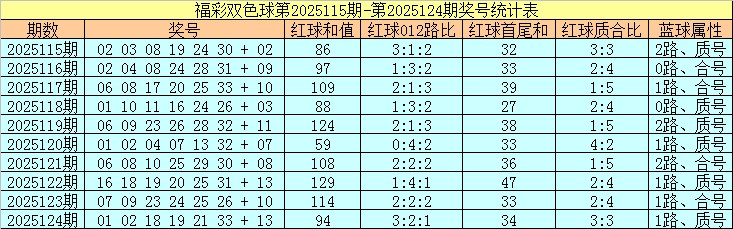 福彩双色球第2025124期红球奖号为:01、02、18、19、21、33,蓝球奖号为:13,其中红球和值为94,012路比为3:2:1,首尾和为34,质合比为3:3,蓝球属性为1路、质号。