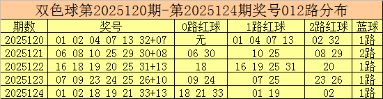 开奖回顾:双色球第2025124期开出奖号:01 02 18 19 21 33 + 13。其中,红球号码012路比为3:2:1,其中0路号码表现活跃。蓝球号码为1路号码。
