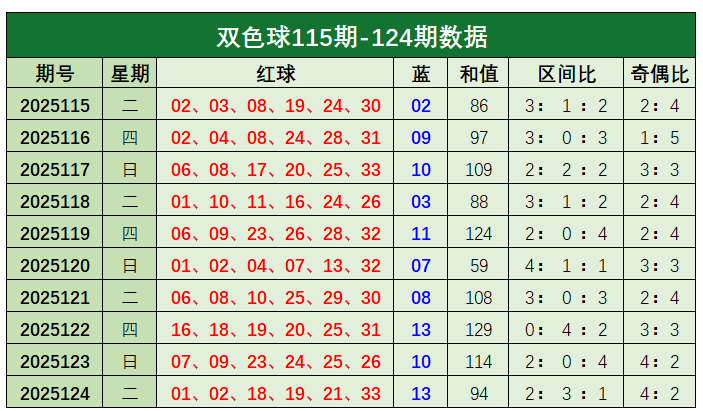 双色球第2025124开奖奖号:红球01、02、18、19、21、33,蓝球13。红球和值为94,区间比为2:3:1,奇偶比为4:2。蓝球开出13。