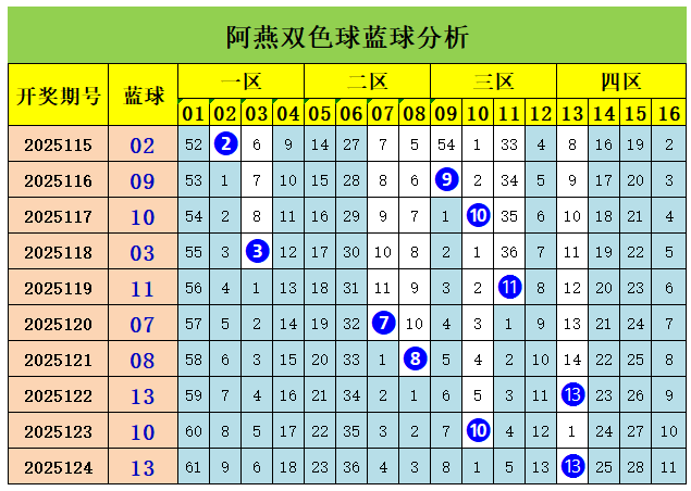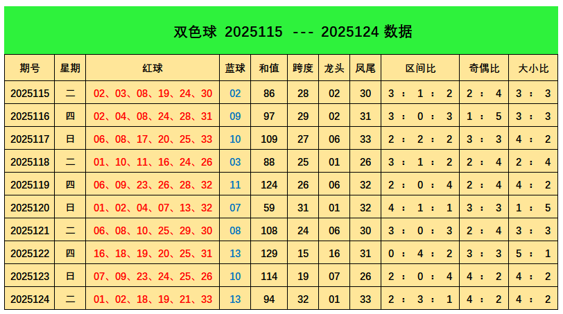 上期回顾:双色球第2025124期开出奖号:红球01、02、18、19、21、33;蓝球13,其中红球三区比为2:3:1,奇偶比4:2,大小比为4:2,蓝球开出1路号码13。