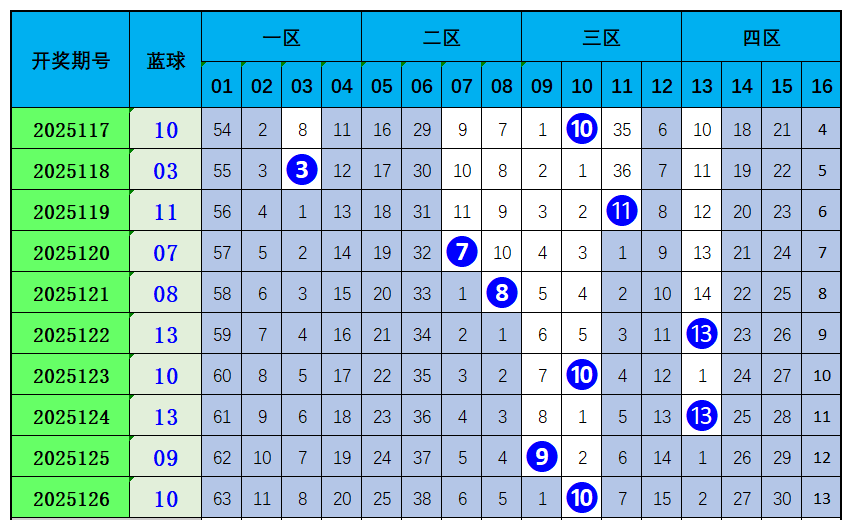 上期开出蓝球号码10,近10期,一区开出1次,二区开出2次,三区开出5次,四区开出2次,总体走势:三区表现较热,本期看好蓝球号码:11。