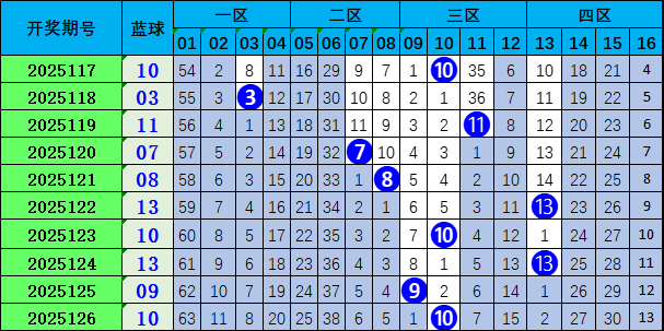 上期蓝球开出偶数号码10。近期奇偶球比值6:4,奇数球走势活跃,本期看好奇数球热出,推荐号码01。