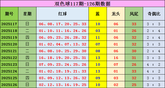 双色球第2025126期开出奖号:02 12 13 16 19 25+10。当期红球号码龙头02,凤尾25,奇偶比为3:3。
