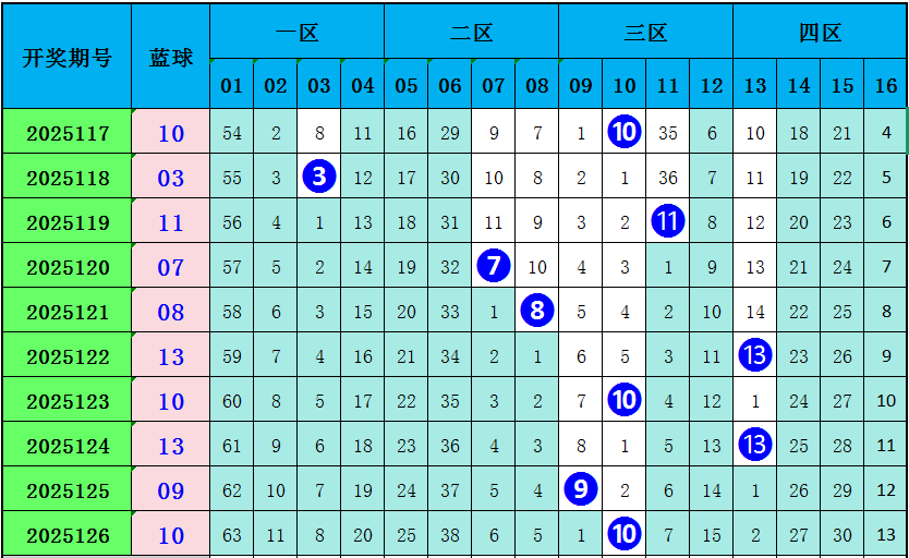 上期蓝球开出号码10,近十期蓝球在一区开1枚,二区开出号码2枚,三区开出5枚,四区开出2枚,区间比1:2:5:2,本期推荐蓝球出现在一区,重点关注02。