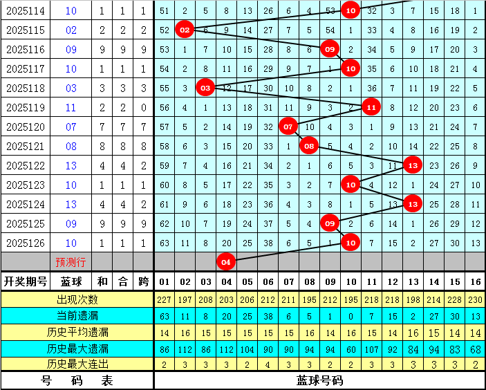 蓝球分析:小 号蓝球近期走势疲软,本期注意小 号蓝球回补,参考蓝球01、03、04、08。