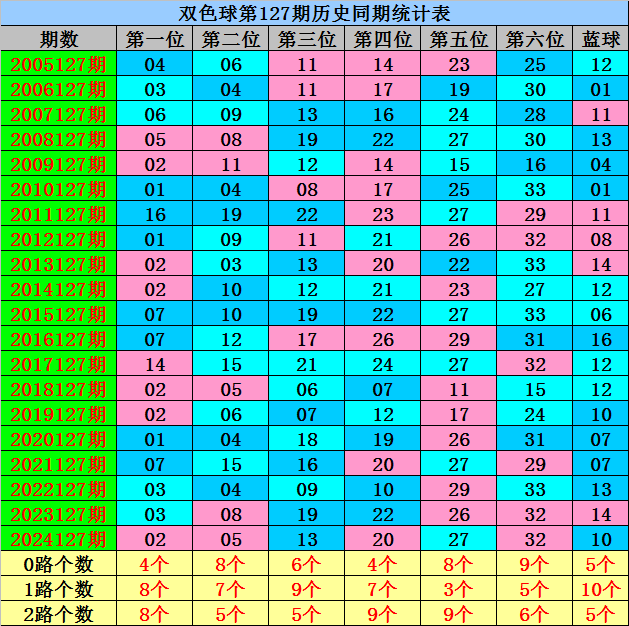 蓝球:历史同期0路号开出:06、12;1路号开出;01、04、07、10、13、16;2路号开出;08、11、14,蓝球012路个数比为5:10:5,目前0路号历史同期相对较冷,遗漏6年,今年同期适当关注回补,看好蓝球12。