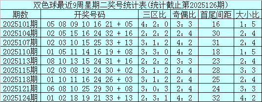 奇偶比分析:最近9周星期二奇偶红球出现个数比为26:28,奇偶红球落号基本持平,本期预计偶数红球热出,奇偶比参考2:4。