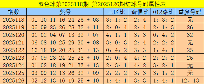红球重号:上期开出2个重复号码:12、13,最近9期有5期开出了重复号码,本期预计重号转冷,不看好出现重复号码。